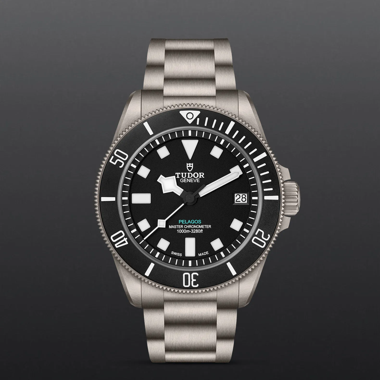 Dreireihiges Armband in Titan mit TUDOR „T‑fit“-Sicherheitsfaltschließe und Tauchverlängerung, neues optisches Indikatorsystem.