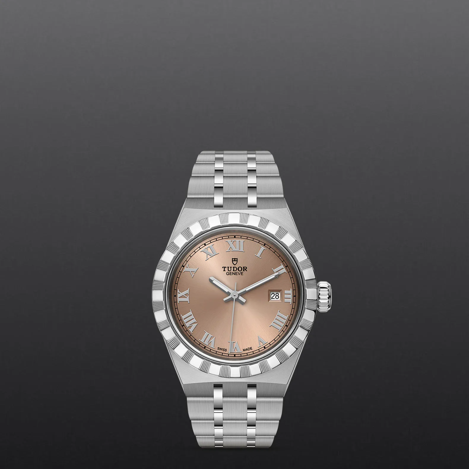 Gehäuse in Edelstahl, 28 mm, Lachsfarbenes Zifferblatt.