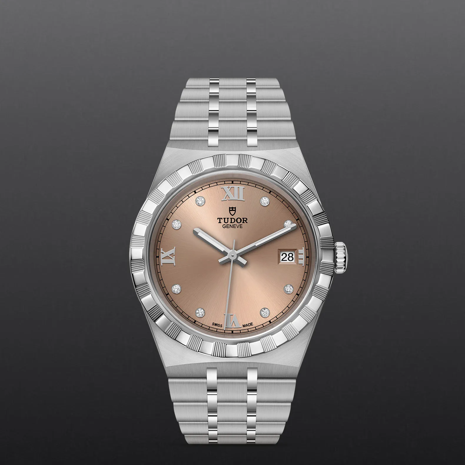 Gehäuse in Edelstahl, 38 mm, Zifferblatt mit Diamanten.