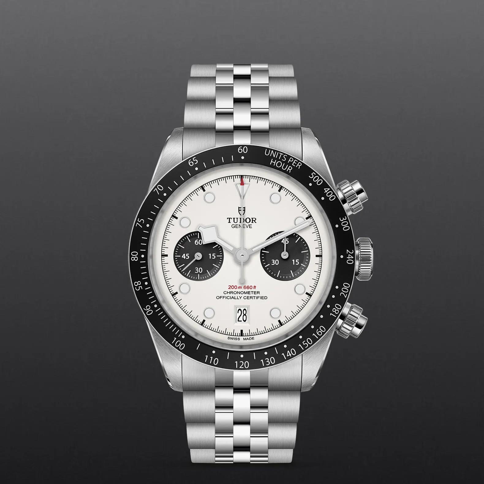 Verschraubbare Aufzugskrone in Edelstahl mit TUDOR Rose im Relief Verschraubbare Drücker in Edelstahl auf der 2‑Uhr‑ und 4‑Uhr‑Position.