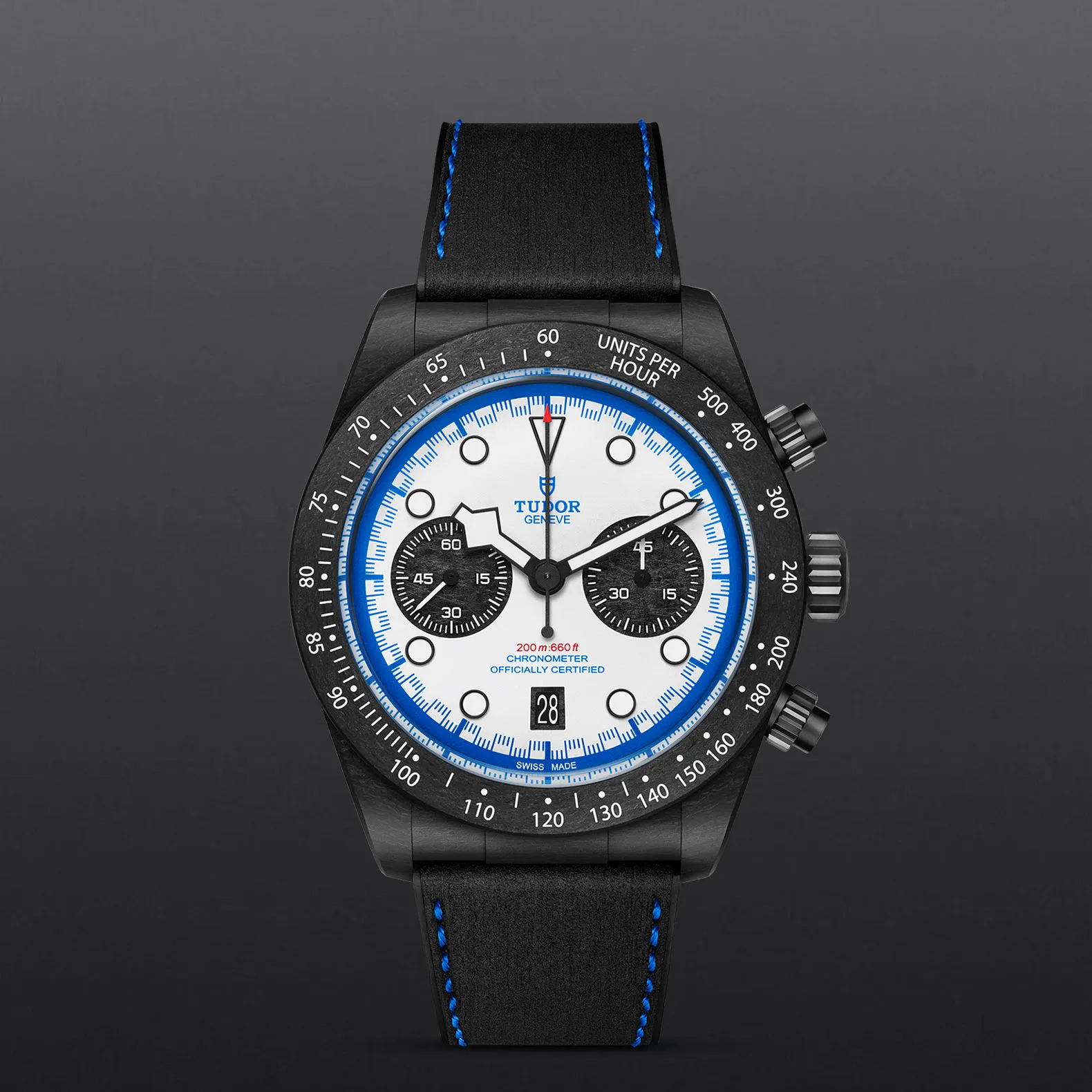 Schwarzes Gehäuse in Carbonfaser, 42 mm, Weißes Zifferblatt.