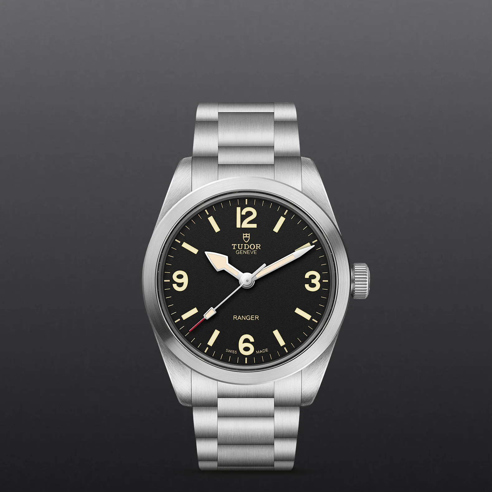 Edelstahlgehäuse von 36 mm, Gewölbtes Zifferblatt in Schwarz.
