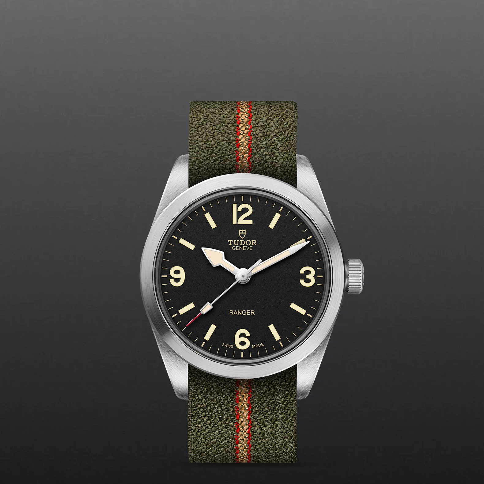 Edelstahlgehäuse von 36 mm, Gewölbtes Zifferblatt in Schwarz.