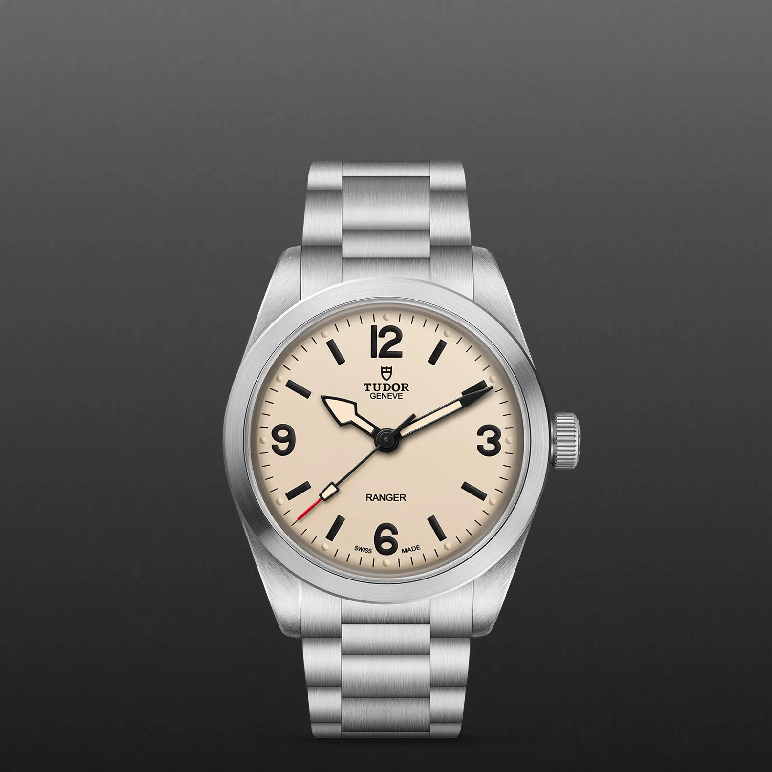 Edelstahlgehäuse von 36 mm, Gewölbtes Zifferblatt in Beige.