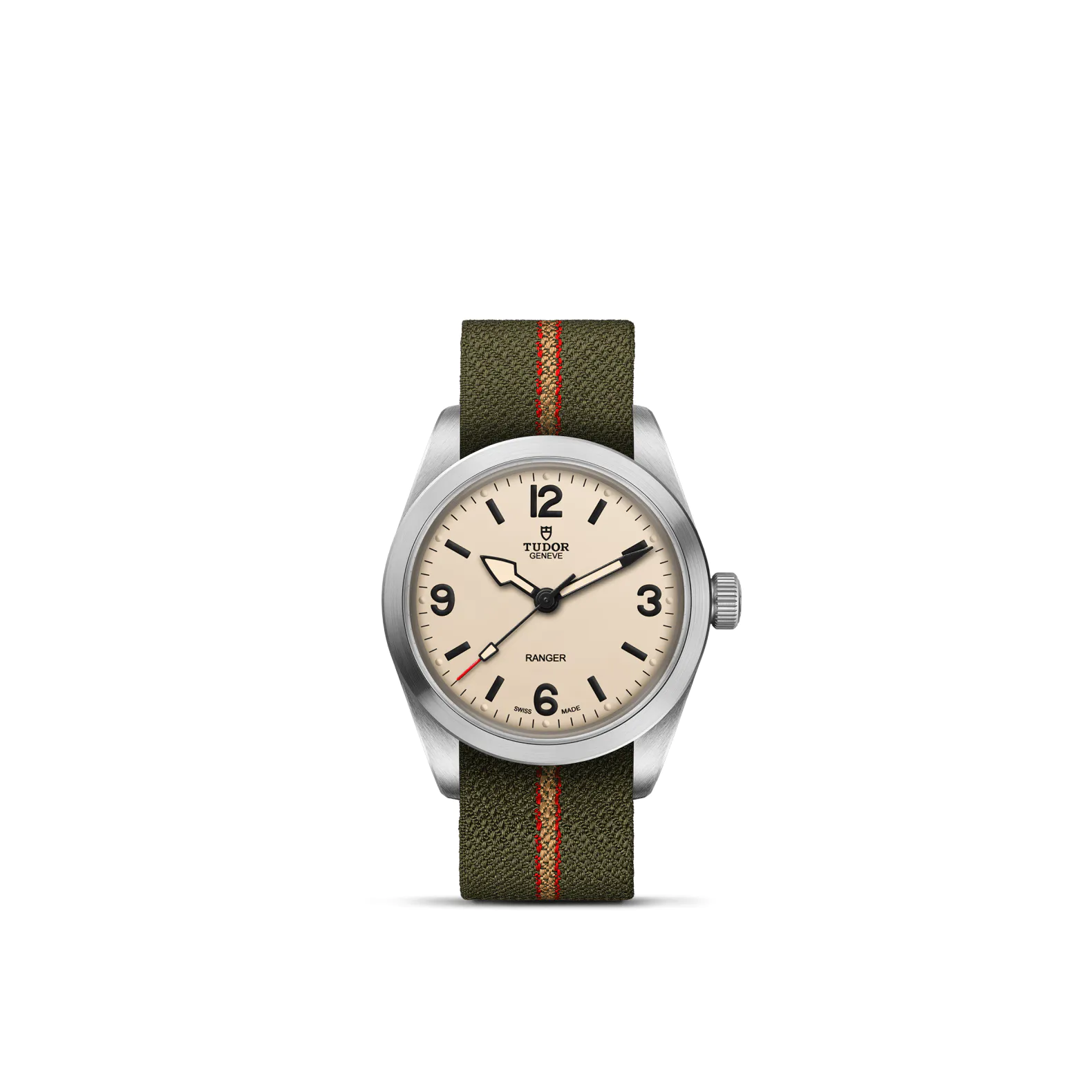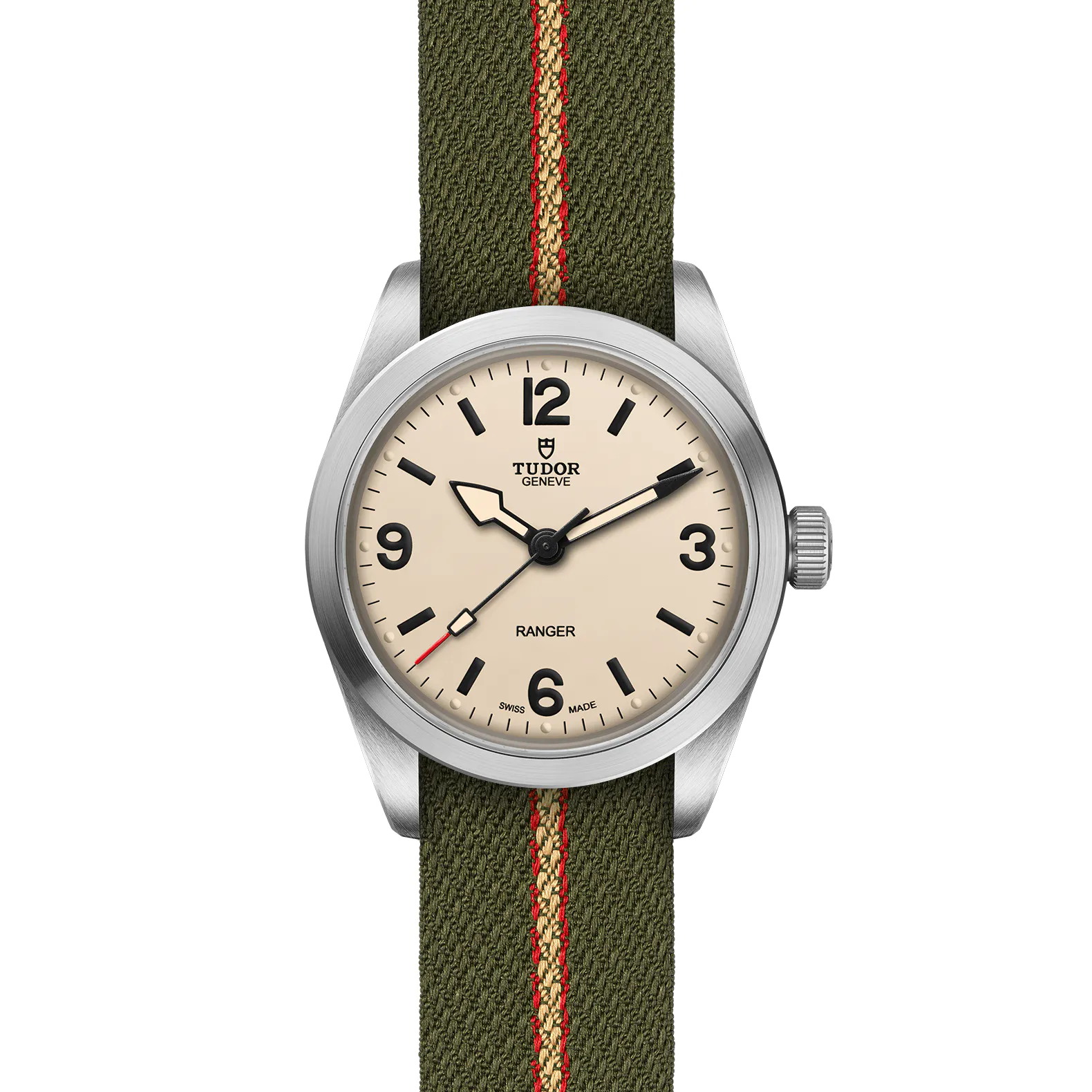 Edelstahlgehäuse von 36 mm, Gewölbtes Zifferblatt in Beige.
