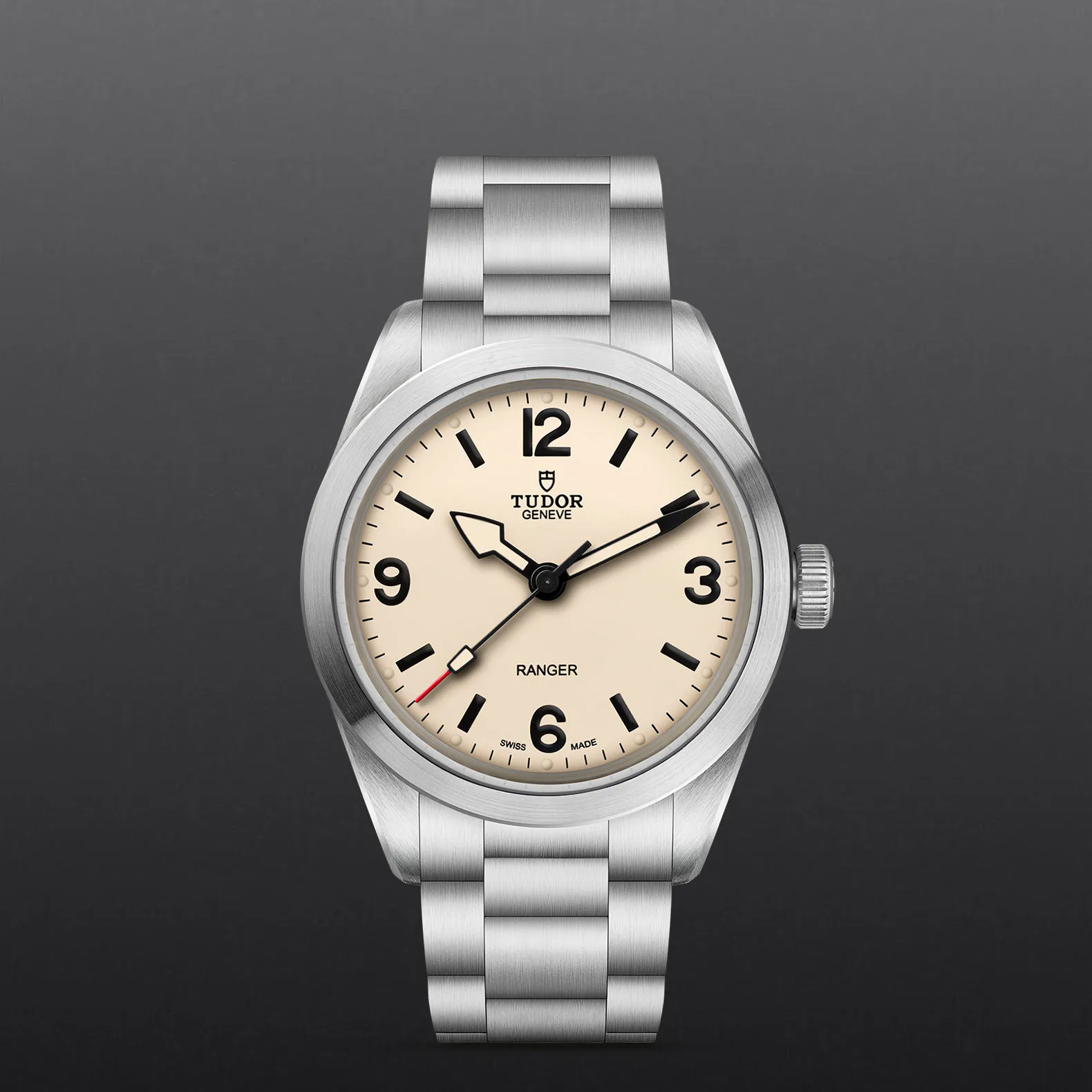 Gehäuse in Edelstahl, 39 mm, Gewölbtes Zifferblatt in Beige.