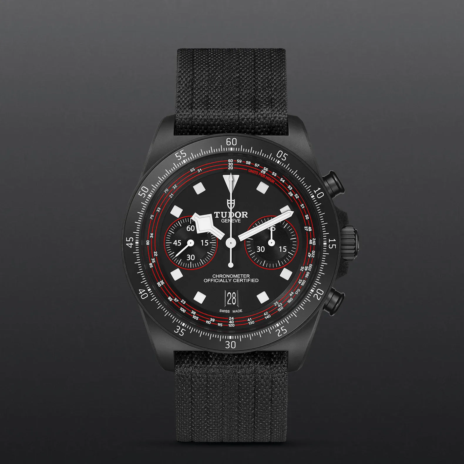 Nero opaco, dettagli rossi sui contatori del cronografo e sulla scala tachimetrica.